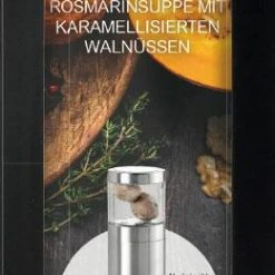 AdHoc Muskatmühle Muskatino Geschenk-Set. Das attraktive Geschenk-Set besteht aus der Muskatmühle Muskatino, 3 Muskatnüssen, einem Rezept für eine Hokkaido-Rosmarinsuppe – und all das kommt in einer edlen Geschenkbox daher.