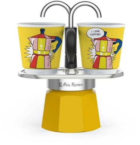 Bialetti Espressokocher Mini Express Lichtenstein als Set mit 2 Bechern. Innovative Zubereitung: Der Espresso läuft direkt in die Tassen, die dank der speziellen Ablage aus Aluminium warm gehalten werden.
