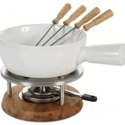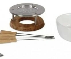 - Käsefondue-Set bestehend aus 1 Käse-Fonduetopf aus Steingut, 1 Edelstahl-Untergestell, 1 Fonduebrenner ohne Flüssigkeit und 4 Edelstahlgabeln mit Eichenholzgriff