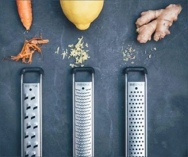 Boska Handreibe Zester Monaco+. Reiben Sie schnell und einfach feine Streifen verschiedener Lebensmittel. Die Reibe ist für halbfesten Käse, roten Pfeffer und Zitrusfrüchte geeignet.