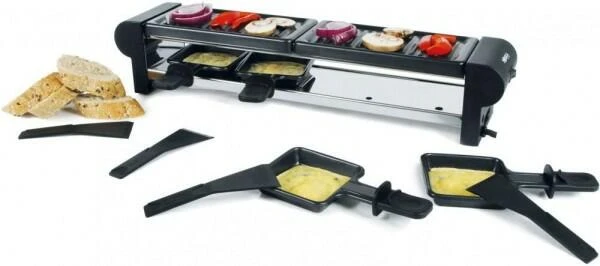 Gemütlich, Raclette zu Viert – beim Käse grillen und genießen. Stundenlanges Essen und Genuss mit herrlichem geschmolzenem Käse auf einer Ofenkartoffel oder einem Stück französisches Brot. Köstlich mit Raclettekäse, aber auch in der Variation mit Mozzarella oder Schafskäse. Lecker, einfach und macht Spaß. Experimentieren Sie und lassen Sie sich überraschen!