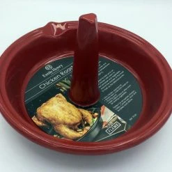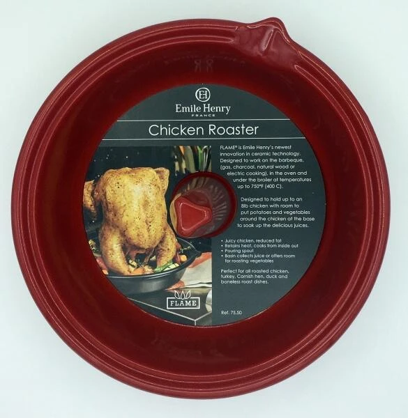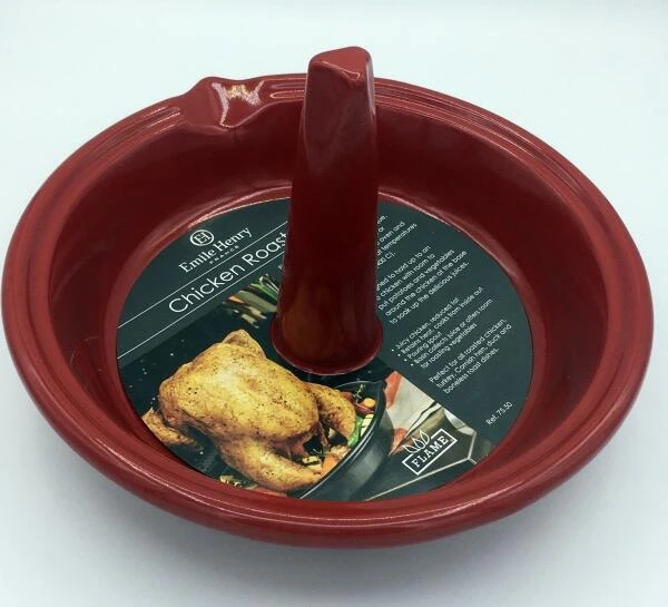 Emile Henry Hähnchenbräter rund in granatapfel. Ideal zum Braten von Hähnchen, Puten und Enten. Durch das aufrechte Braten im Backofen wird die Geflügelhaut außen schön braun und knusprig.
