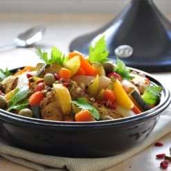 Seit Jahrhunderten kochen die Menschen in Marokko und entlang der südlichen Mittelmeerküste in der Tajine – einem Schmortopf aus Ton oder Lehm. Er hat einen dicht schließenden Deckel, in dem die Speisen (Fleisch, Gemüse, Obst etc.) mit einer geringen Wasserzugabe im eigenen Saft gegart werden. Bei den Gerichte aus der Tajine, die ebenfalls Tajine heißen, sind Kreativität und Phantasie gefragt. Das Spiel mit Zutaten in verschiedenen Formen und Farben, die attraktiv eingeschichtet werden, bevor man den Deckel schließt, macht das Kochen in und Essen aus der Tajine zu einem besonderen Erlebnis.