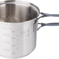 Es besteht aus zwei hochwertigen Edelstahl-Töpfen, dem Stand mit Brenner und einem praktischen Netzbeutel für den Transport. Der größere Topf hat eine ml-/ oz-Skala und fasst ca. 985 ml, der kleinere, der zugleich Deckel des größeren ist, 470 ml.