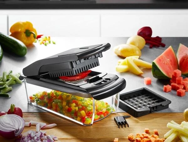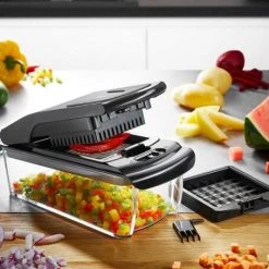 Extrascharfe Messereinsätze sorgen für müheloses Schneiden und gleichmäßige Resultate – von fein für gesunde Rohkost oder Suppeneinlagen bis grob für Pommes Frites oder leckere Eintöpfe. Perfekt auch zum Würfeln von Fetakäse.