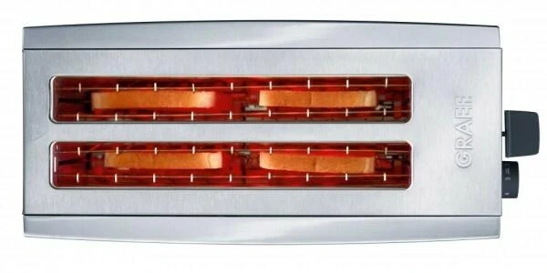 Graef 4 Scheiben Edelstahl Toaster TO 100 im klassischen Silber, bräunt Ihnen gleich vier Toasts auf einmal. Die langen Wartezeiten auf einen Toast, während die Familie bereits am Frühstückstisch sitzt, gehören der Vergangenheit an. Mit dem 4 Scheiben Edelstahl Toaster TO 100 verwöhnen Sie die ganze Familie mit knusprigen Toasts. Das Ziel – knusprige XXL-Toasts und bester Geschmack. Mmmmmh, riechen Sie schon den Duft von frisch geröstetem Toastbrot?