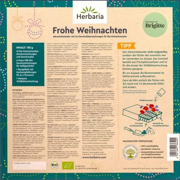 Herbaria Gewürz-Adventskalender. 24 Gewürz-Überraschungen in Bio-Qualität, für jede enthaltene Bio-Gewürzmischung ein Rezept zum Nachkochen für 4 Personen. Als Extra: Wildblütenmischung zur Aussaat in den kompostierbaren Innenteil des Kalenders.