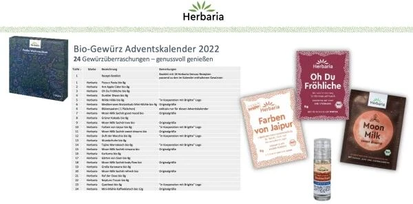 Bereiten Sie sich oder anderen eine ganz besondere Freude mit dem Herbaria Gewürz-Adventskalender. Hinter den einzelnen Türchen verbergen sich neben den beliebtesten Herbaria Gewürzmischungen mit passenden Rezeptideen auch Winter-Getränkemischungen und Probierpäckchen der Moon Milk von Herbaria.