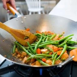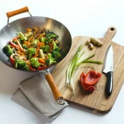 Ein traditioneller chinesischer Wok aus 1,8 mm starkem Karbonstahl, der vor der ersten Nutzung eingebrannt werden sollte. Eine natürliche, effektive Antihaftbeschichtung (Patina) bildet sich im Lauf der Verwendung. Der flache Boden sorgt dafür, dass der Wok gut ausbalanciert ist und nicht umkippt, wenn er auf dem Herd steht. Er ist für alle Herdarten inklusive Induktion geeignet.