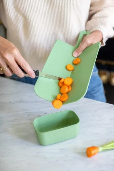 Das faltbare Schneidebrett SNAP ist dank abgeschrägtem Rand leicht anzuheben und durch das Material klingenschonend sowie 100% CO2-neutral. Die Bretter sind spülmaschinengeeignet und frei von BPA und Melamin.