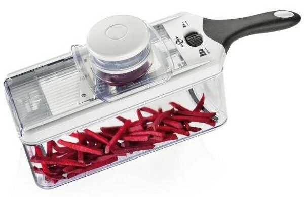 - Lieferumfang: 1 x Gemüsehobel Vario inkl. 4 x Messereinsätze, 1 x Restehalter, 1x Auffangbehälter