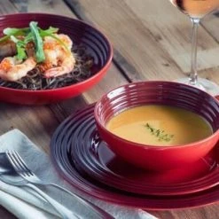 Le Creuset Frühstücksteller in kirschrot. Der Teller eignet sich sowohl als Frühstücksteller als auch für die nachmittägliche Kaffeetafel.