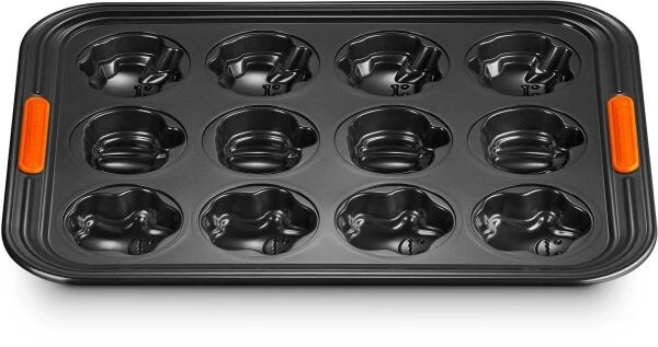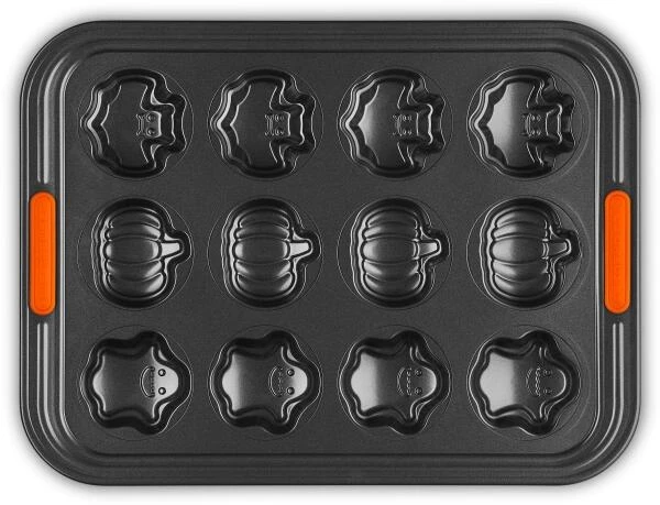 Le Creuset Halloween-Backform, 12er. Die Backform ist mit einer exzellenten Antihaftbeschichtung ausgestattet und enthält 12 Kammern zum Backen köstlicher Muffins oder anderer Küchlein in Kürbis-, Gespenst- oder Fledermaus-Form.