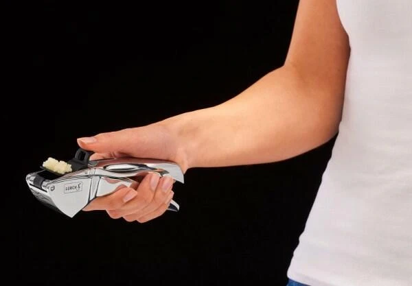 Durch die besonders effiziente Kraftverteilung, können sogar ungeschälte Knoblauchzehen kinderleicht gepresst werden. Einfach die Presse auf den Tisch legen, von oben auf den Griff drücken und schon kommt der gepresste Knoblauch aus dem praktischen Auswerfer heraus.