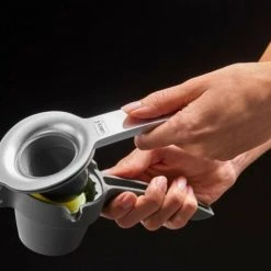 Mit dieser Zitruspresse gelingt das mühelose Auspressen von Limetten, Zitronen und kleinen Orangen. Die Bedienung ist dank Hebelmechanik besonders leicht und aufgrund des speziellen Ausgießers ist eine ideale und saubere Dosierung für Cocktails, Dressings oder Fisch gewährleistet. Eine selbsterklärende Anwendung ist dank des intuitiven Designs sicher. Und darüber hinaus passt die Presse durch ihre kompakte Größe in jede Schublade.