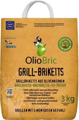 Grillen Sie mit dem Testsieger der Süddeutschen Zeitung (August 2015), ohne auf Leistung zu verzichten. OlioBric Grill-Briketts sind die klimaschonende Alternative für passionierte Griller. Die innovativen, nachhaltigen und ökologisch zertifizierten Heiz-und Grillbriketts werden statt aus Tropenholz in einem EU-patentierten Verfahren aus Brennrückständen des Olivenkerns (Oliven-Trester), also einer Biomasse aus erneuerbarer Energie, gewonnen. Ein flüssig Pulverisierungsverfahren reguliert das an die Umwelt abgegebene Luft-Gasgemisch und die Staubbelastung wird durch ein Extraktionsverfahren so gut wie möglich reduziert. Die in Griechenland hergestellte Grillkohle besteht ausschließlich aus 100% natürlichen Rohstoffen wie Olivenkernen, Stärke und Wasser und ist die Einzige, die von NABU unterstützt und empfohlen wird. Das Produkt und das hierfür angewendete Fertigungsverfahren wurden seit 2009 bereits zum zweiten Mal – zuletzt 2014 – mit dem EMAS-Award der EU für „nachhaltiges Wirtschaften“ ausgezeichnet & zertifiziert.