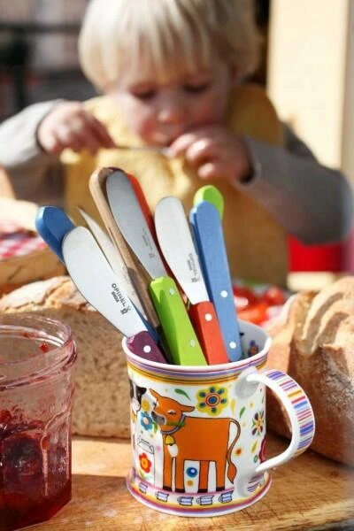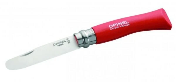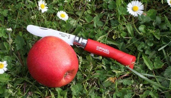 Opinel auf. Um die Verletzungsgefahr zu minimieren, wurde die Klinge sorgfältig abgerundet. Der für Opinel typische Feststellring schützt beim Gebrauch zuverlässig vor dem Einklappen der Klinge.