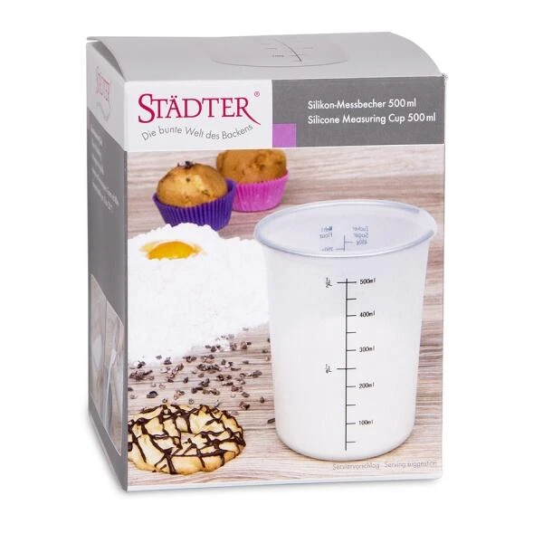 Messbecher aus flexiblem, lebensmittelechtem Silikon. Temperaturbeständig von –30 bis +230°C. Geeignet für Backofen und Froster.