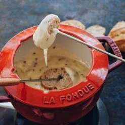 Staub Fondueset aus Gusseisen kirschrot. Fonduetöpfe aus Gusseisen speichern Hitze ideal und halten das Fett oder die Brühe besonders lange heiß – bei Tisch, wenn Sie mit Freunden das Fondue zelebrieren.