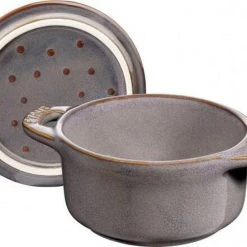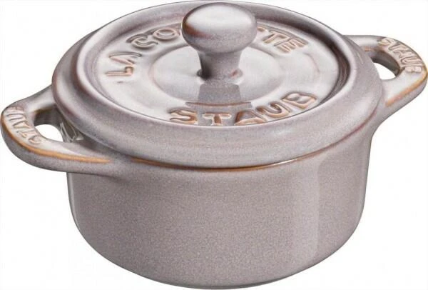 Staub Mini Cocotte in antikgrau. Diese hübsche Cocotte aus Keramik ist bestens geeignet für das Zubereiten und Servieren von kleinen Portionen.