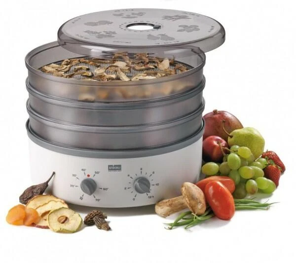 Mit dem Stöckli dörrex Dörrautomat wird das Trockenen von Früchten, Kräutern und Fleisch zum Kinderspiel! Die verschiedenen Dörrzeiten für das jeweilige Dörrgut sind auf dem transparenten Deckel eingeprägt. Durch die stufenlose Temperaturfeineinstellung und aktive Warmluftzirkulation wird ein perfektes Dörrergebnis garantiert. Die feinmaschigen Metalldörrgitter eignen sich u.a. sehr gut zum Trocknen von Kräutern. Insgesamt kann das Gerät mit bis zu 10 Dörrgittern betrieben werden. Inklusive 12 Stunden Zeitschaltuhr, 3 Metall-Dörrgittern und LED-Anzeige.